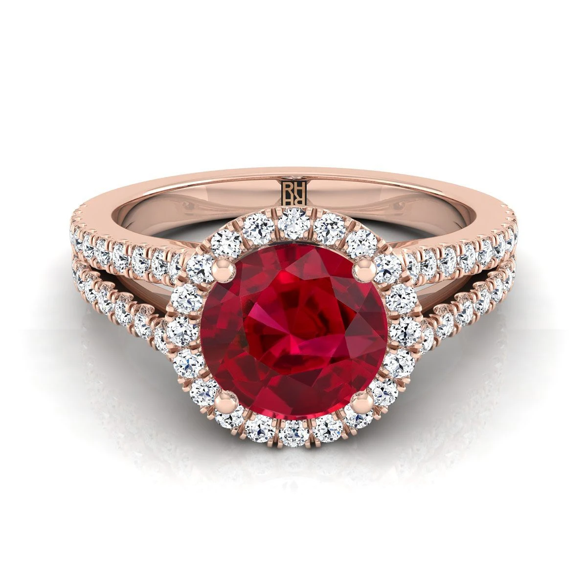 14K Rose Gold Round Brilliant Ruby Halo Center With French Pave Split Shank Engagement Ring -3/8ctw