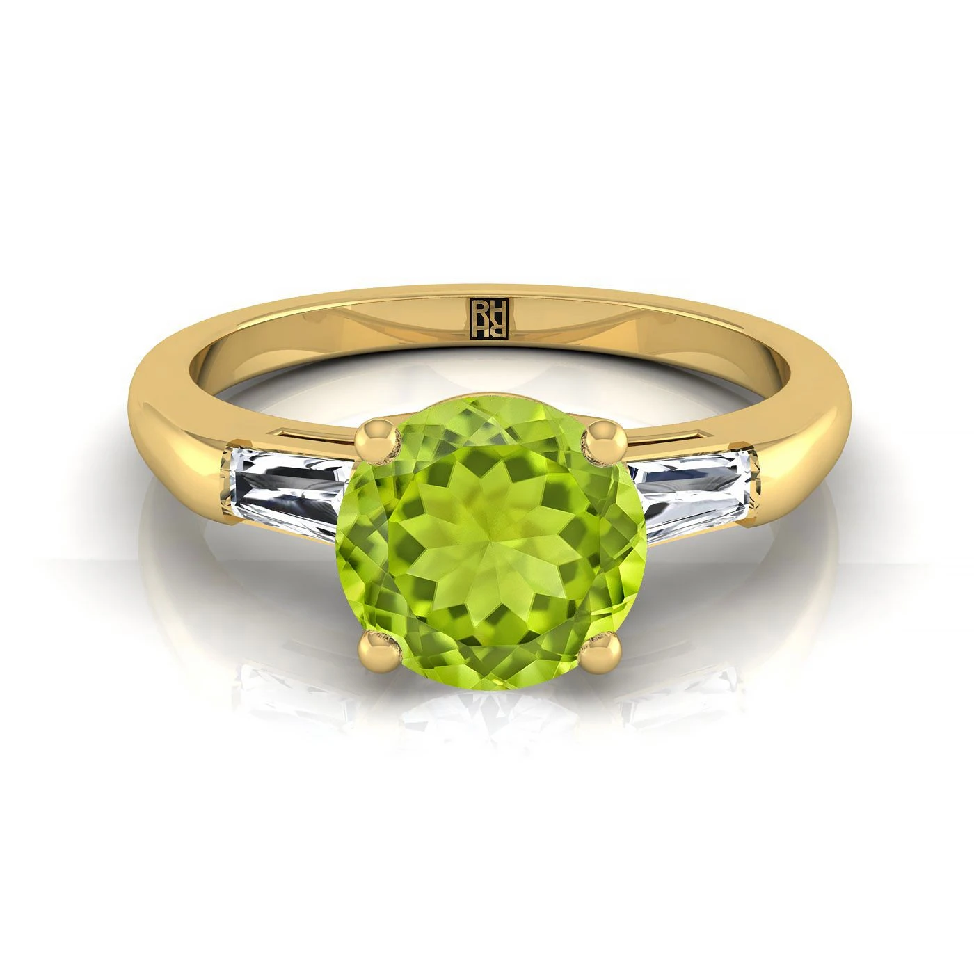 14K Yellow Gold Round Brilliant Peridot Three Stone Tapered Baguette Engagement Ring -1/5ctw