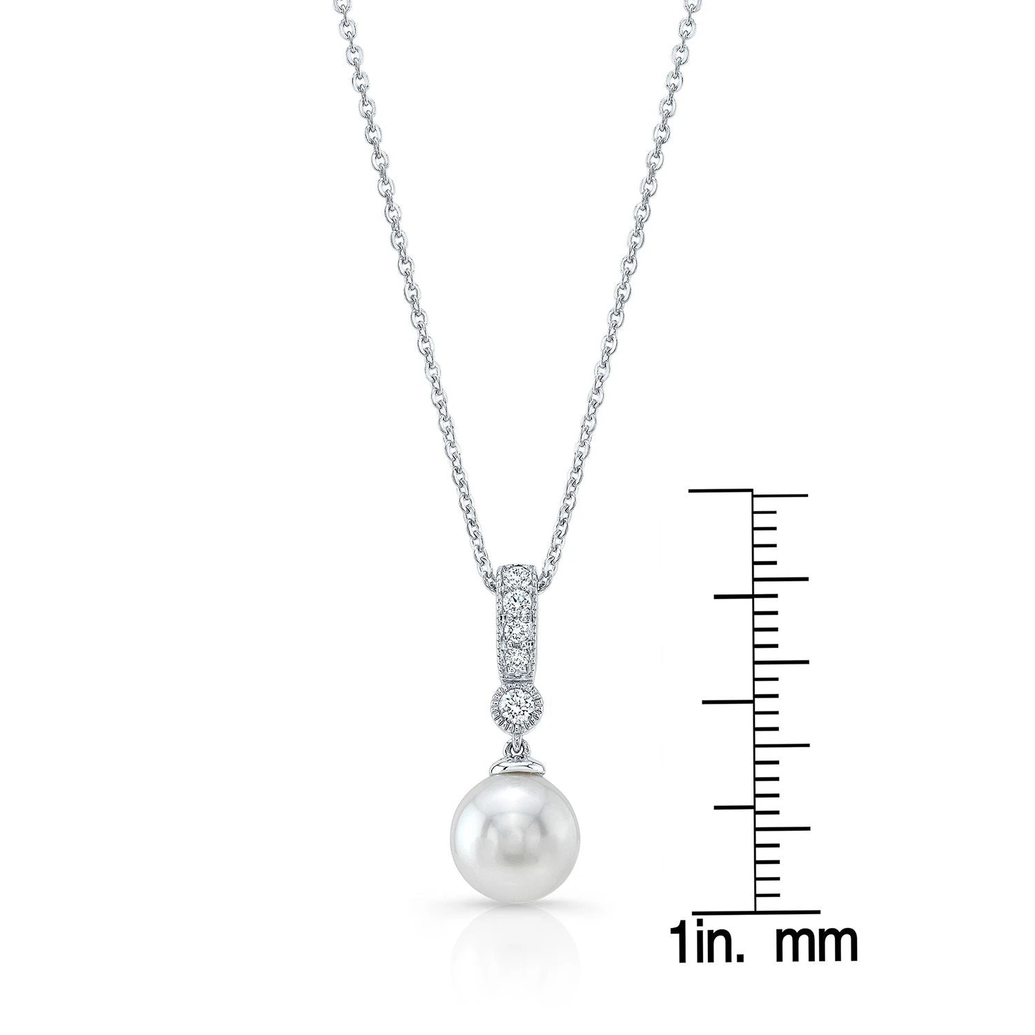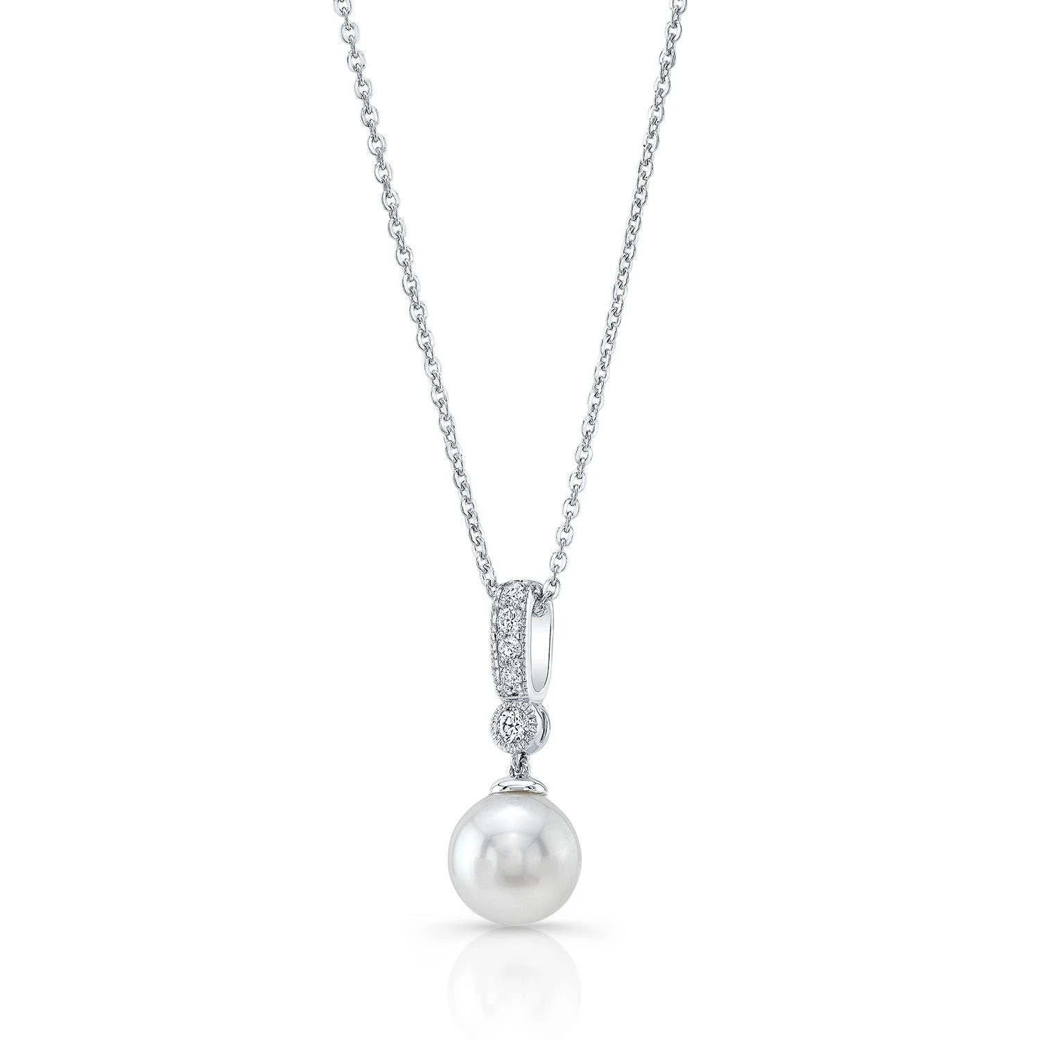 14k White Gold Pendant With 1 White Cultured Pearl At 8.0-8.5mm And 5 Round Brilliant Diamonds Weighing 0.12ctw On An 18-inch Adjustable Rolo Chain