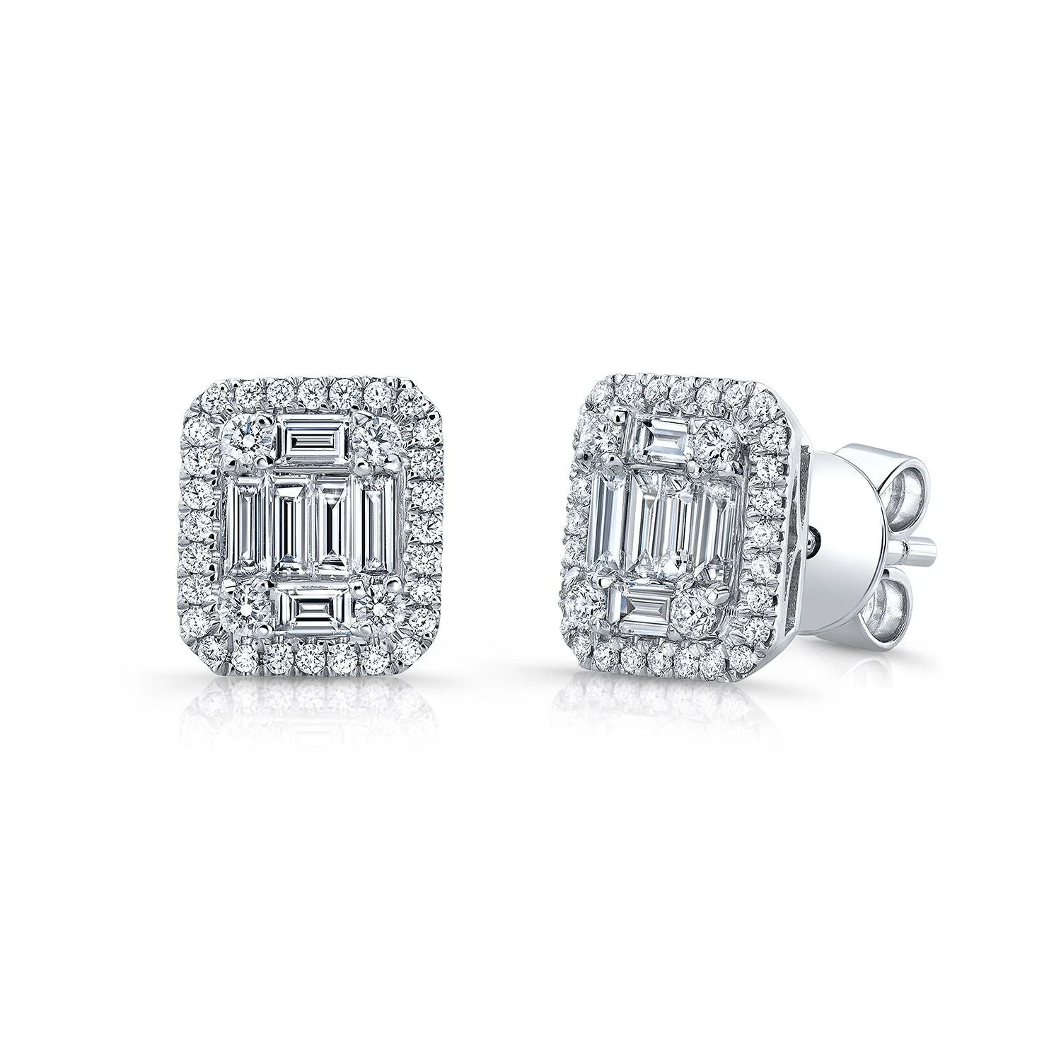 Diamond Baguette And Round Illusion Emerald-cut Halo Earrings In 14k White Gold