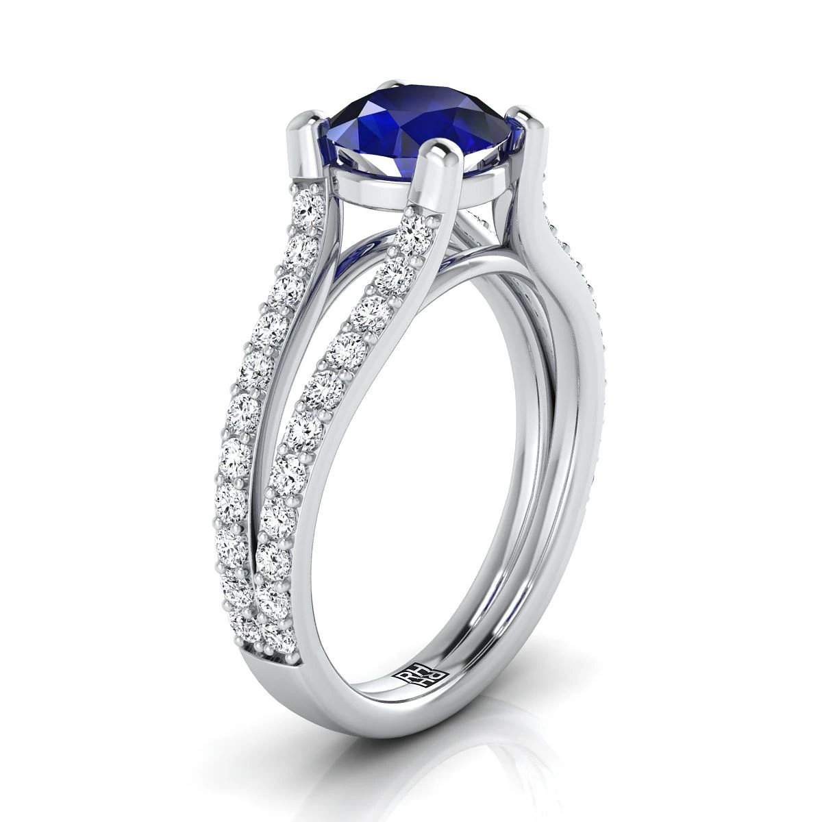 Platinum Round Brilliant Prong Set Sapphire Split Shank Engagement Ring