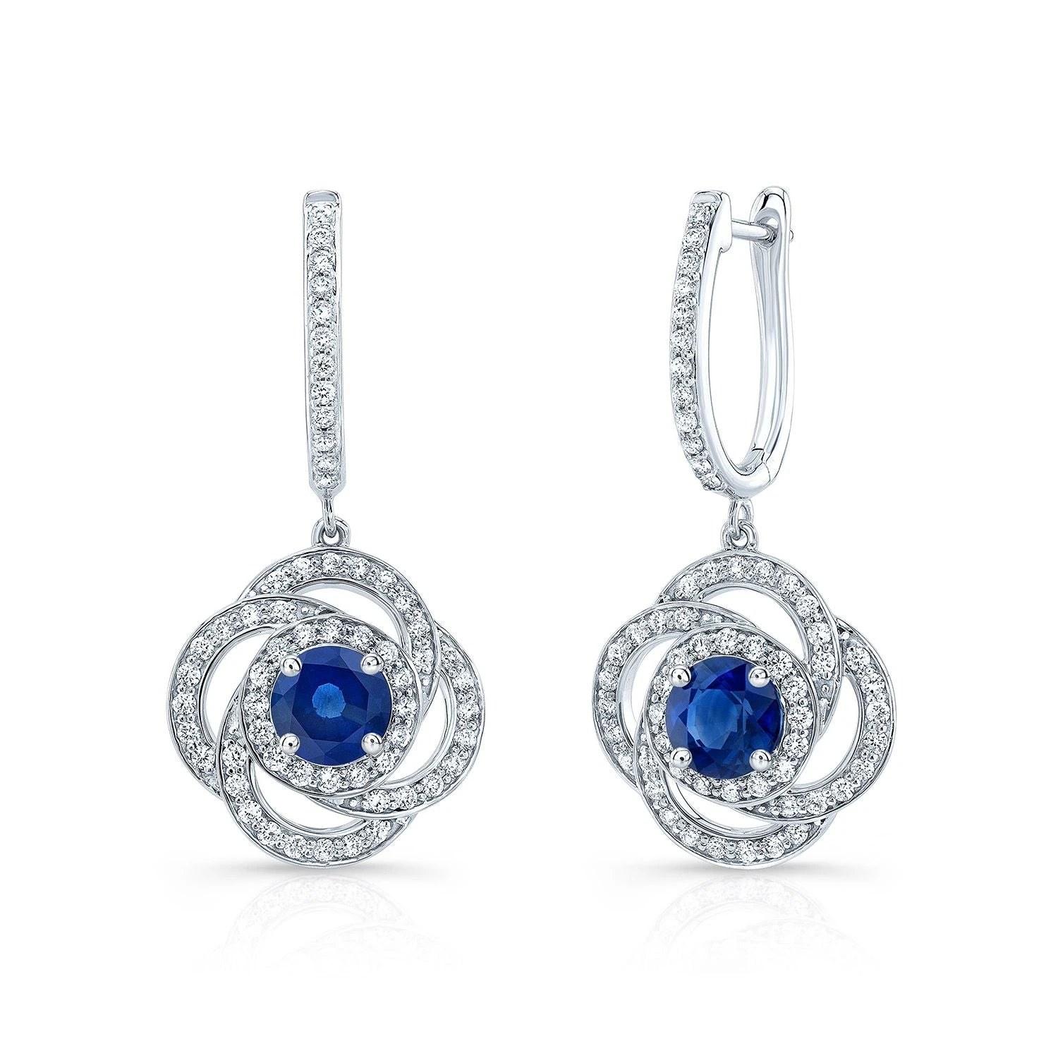 Sapphire And Diamond Round Dangle Earrings With Pave Love Knot Frame In 14k White Gold (5.5mm)